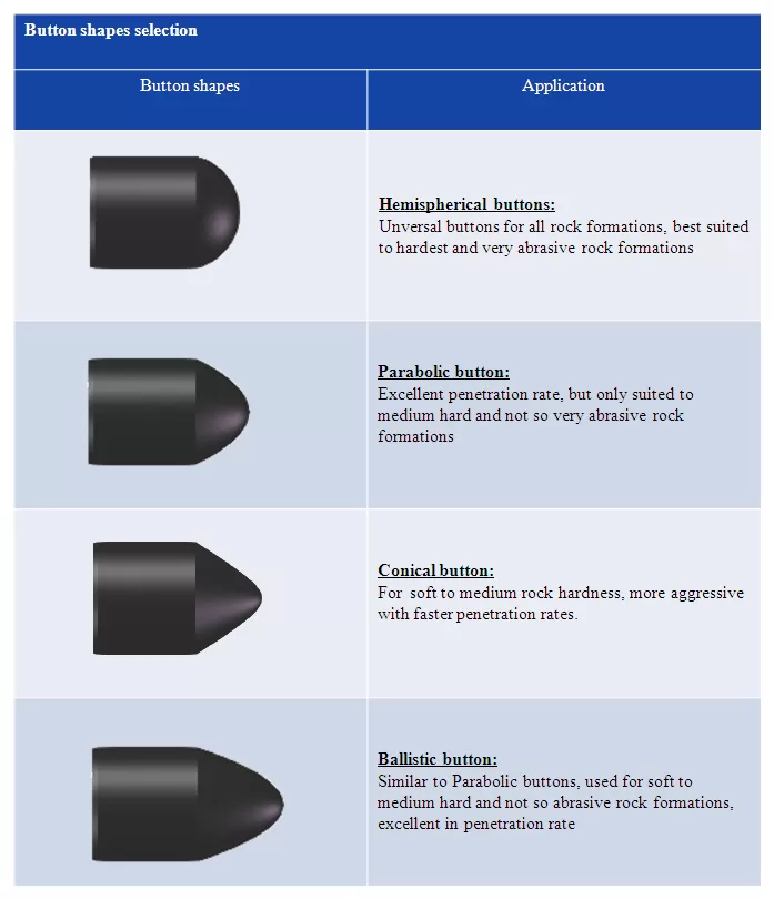 Thread الأحجام: R25 ، R28 ، R32 ، R35 ، R38 ، T38 ، T45 ، T51 ، ST58 ، ST60 ، GT60 ؛ أقطار الرأس: 33 مم ~ 152 مم ؛ تصاميم الوجه ؛ وجه مسطح ، مركز إسقاط ، وجه أحادي ؛