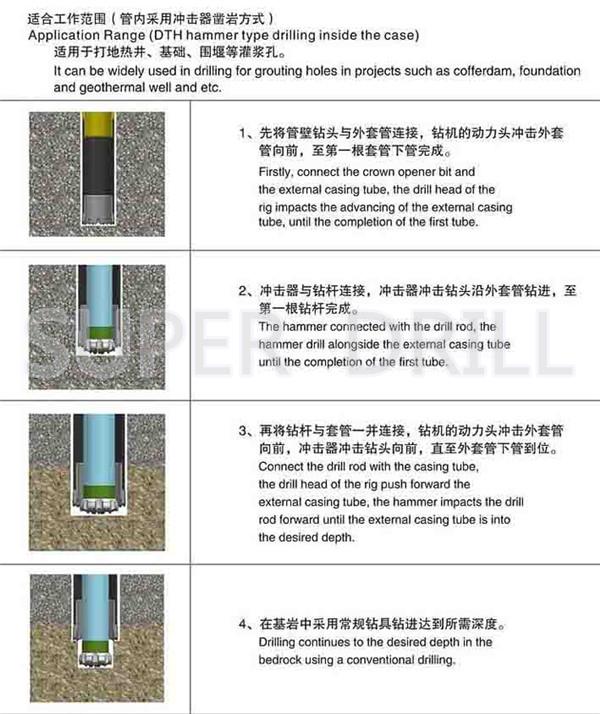 Perforación tipo martillo DTH dentro de la caja Puede ser ampliamente utilizado en la perforación de agujeros de lechada en proyectos como ataguía, cimentación y pozo geotérmico y etc.