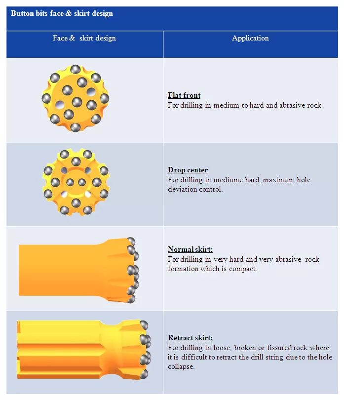 Tamanhos de rosca: R25, R28, R32, R35, R38, T38, T45, T51, ST58, ST60, GT60; Diâmetros da cabeça: 33mm ~ 152mm; Desenhos de rosto; face plana, centro de queda, uni-face;