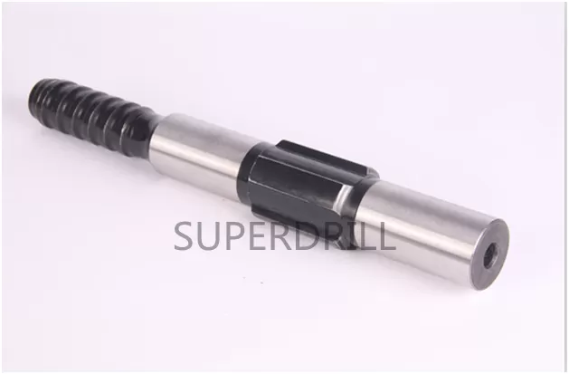 In a indústria de perfuração, existem muitas maneiras em relação às conexões entre diferentes peças de reposição, por exemplo, para hastes de perfuração cônicas e brocas cônicas, o grau de afunilamento é uma maneira. Embora haja outra maneira, que é por fios. Isso significa que diferentes peças de reposição podem ser conectadas por roscas. Portanto, dizemos adaptadores de haste, acoplamentos, hastes de extensão, Cross Bits rosqueados e brocas de botão rosqueadas pertencem a produtos de perfuração rosqueados. O adaptador de haste é usado para transmitir energia entre a furadeira e as hastes da broca. Uma extremidade é conectar a broca, outra extremidade é conectar as hastes da broca, dessa forma, a energia da furadeira é transmitida para as brocas, finalmente as rochas são cortadas. No mundo, existem diferentes máquinas de perfuração, portanto, diferentes adaptadores de haste estão disponíveis.