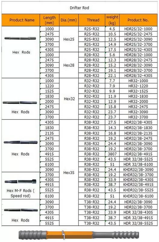 Haste de perfuração de rosca Feito com barra de aço carbono da melhor qualidade, através de tratamento térmico como Atlas e Sandvik.