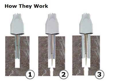 Phase 1, Primeiro, um furo de diâmetro e profundidade precisos é perfurado no material. O conjunto de cunhas (uma cunha e duas cunhas de contador) é inserido no furo.