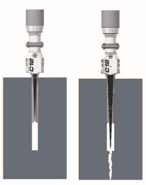 First of all, a hole is drilled to a specified diameter and dept using an ordinary rock drill. Then the wedge set is inserted into the hole with the wedge in a retraced position. The hydraulic pressure then forces the wedge between the two counter wedges, pressing them against the walls of the drilled hole. The effective splitting force of up to 413 tons or 4048 kN breaks concrete and rock from the inside, breaking thinner iron rods at the same time.